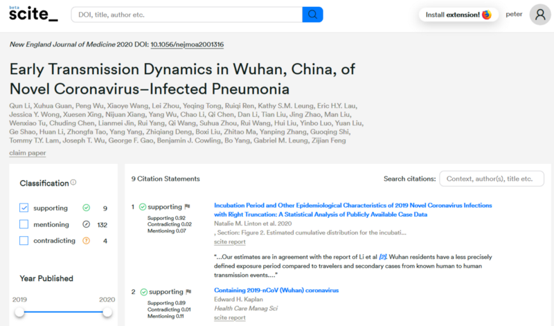 To show the utility of scite when looking at COVID-19 papers, let’s take a single example report — “Early Transmission Dynamics in Wuhan, China, of Novel Coronavirus–Infected Pneumonia” — published in the New England Journal of Medicine.
