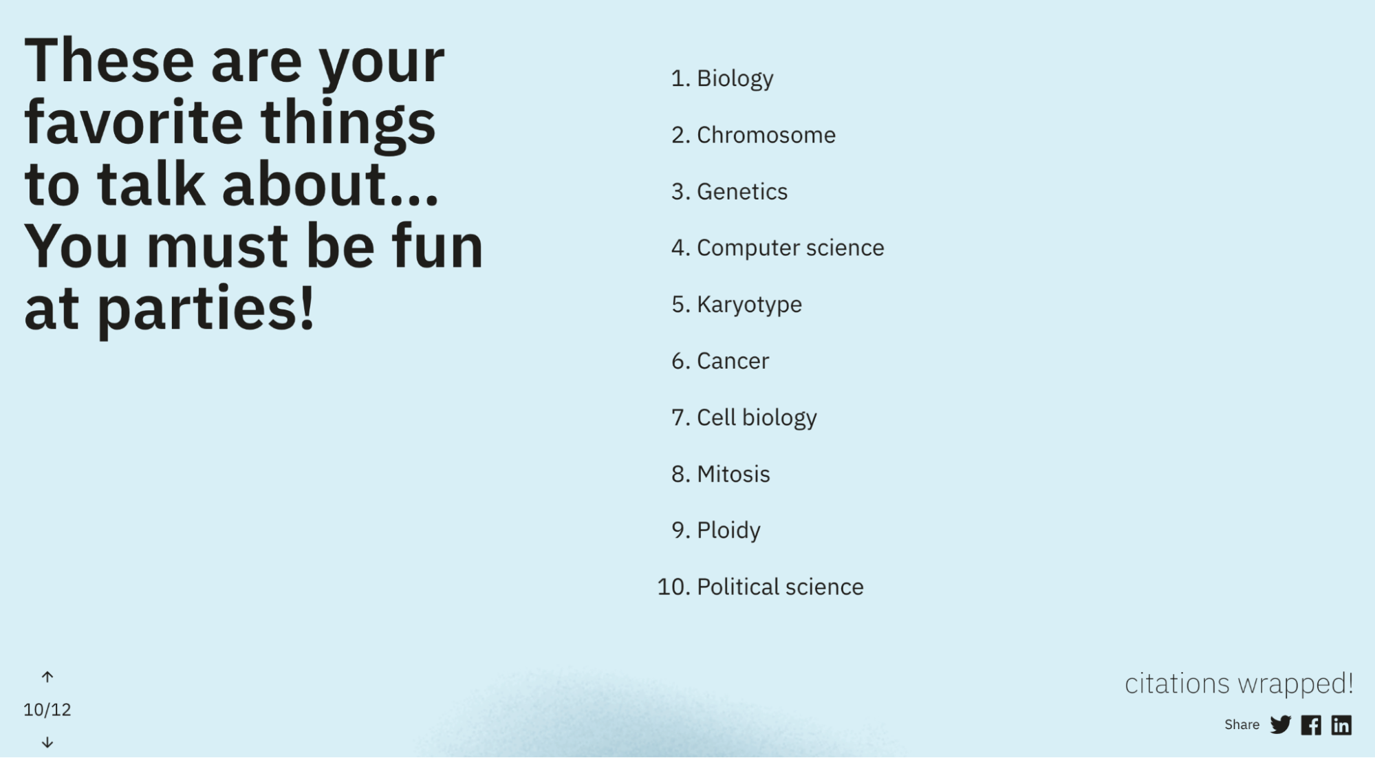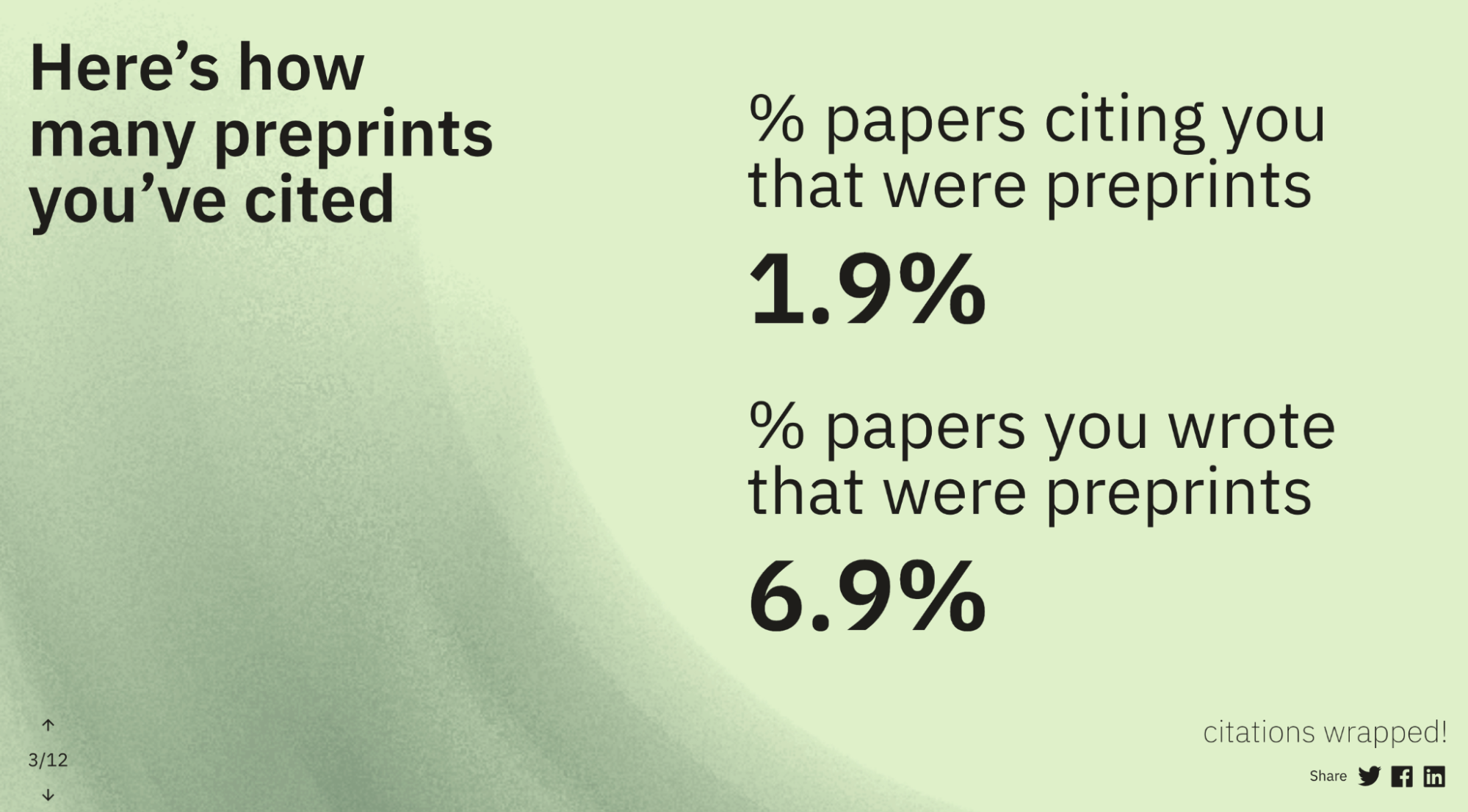 Today we are happy to announce the launch of scite digest, a new way to visualize and share key metrics about your work as a published author. scite digest takes inspiration from Spotify Wrapped, an annual initiative from Spotify that allows music listeners to better understand their listening patterns and to share this information socially. scite digest shows authors various metrics about their publications, including the percentage of open access articles they have published, the number of citations they have received and made to preprints, their self-citation rate, which journals they have published the most in, which subjects their articles are under, and other various informative and fun metrics about their writing behavior.