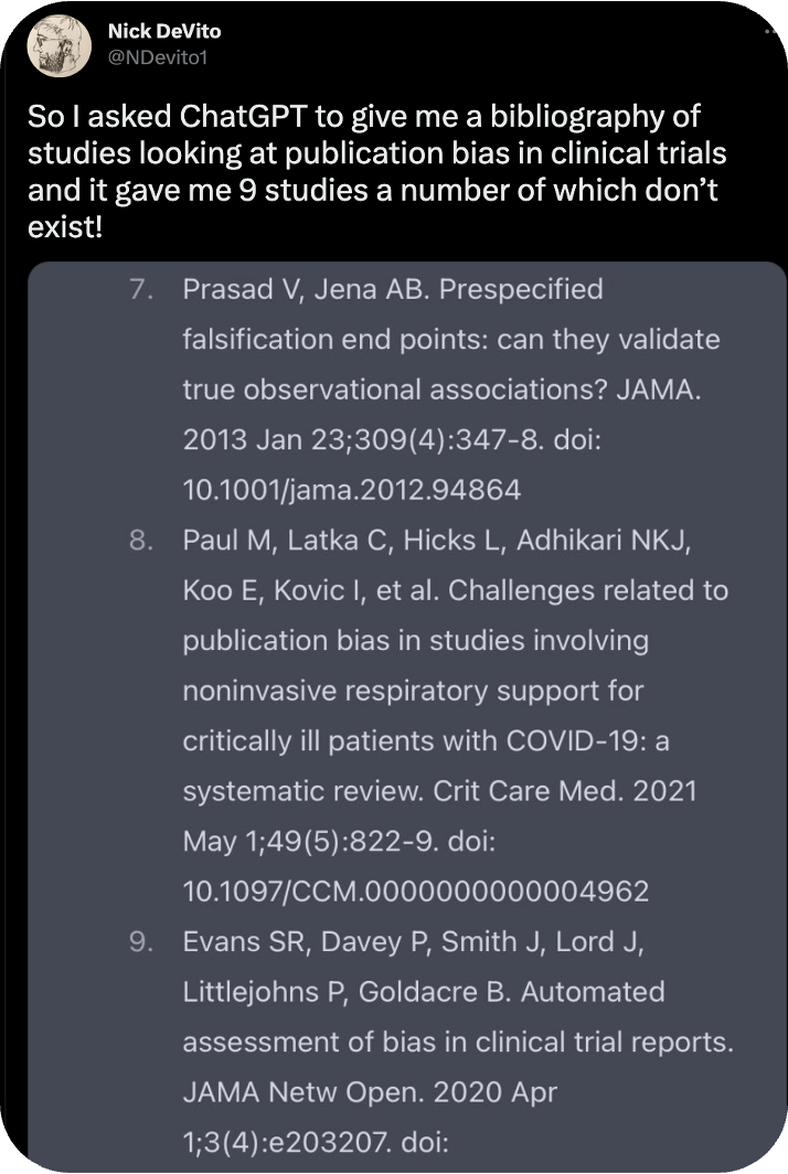 Here's where most AI tools stumble badly: they make things up. Not occasionally or rarely. Consistently enough that you can't trust them without verification. Large language models predict text based on patterns, not facts. When you ask ChatGPT for sources on publication bias in clinical trials, it might cite "Prasad V, Jena AB. Prespecified falsification end points: can they validate true observational associations? JAMA. 2013 Jan 23;309(4):347-8."