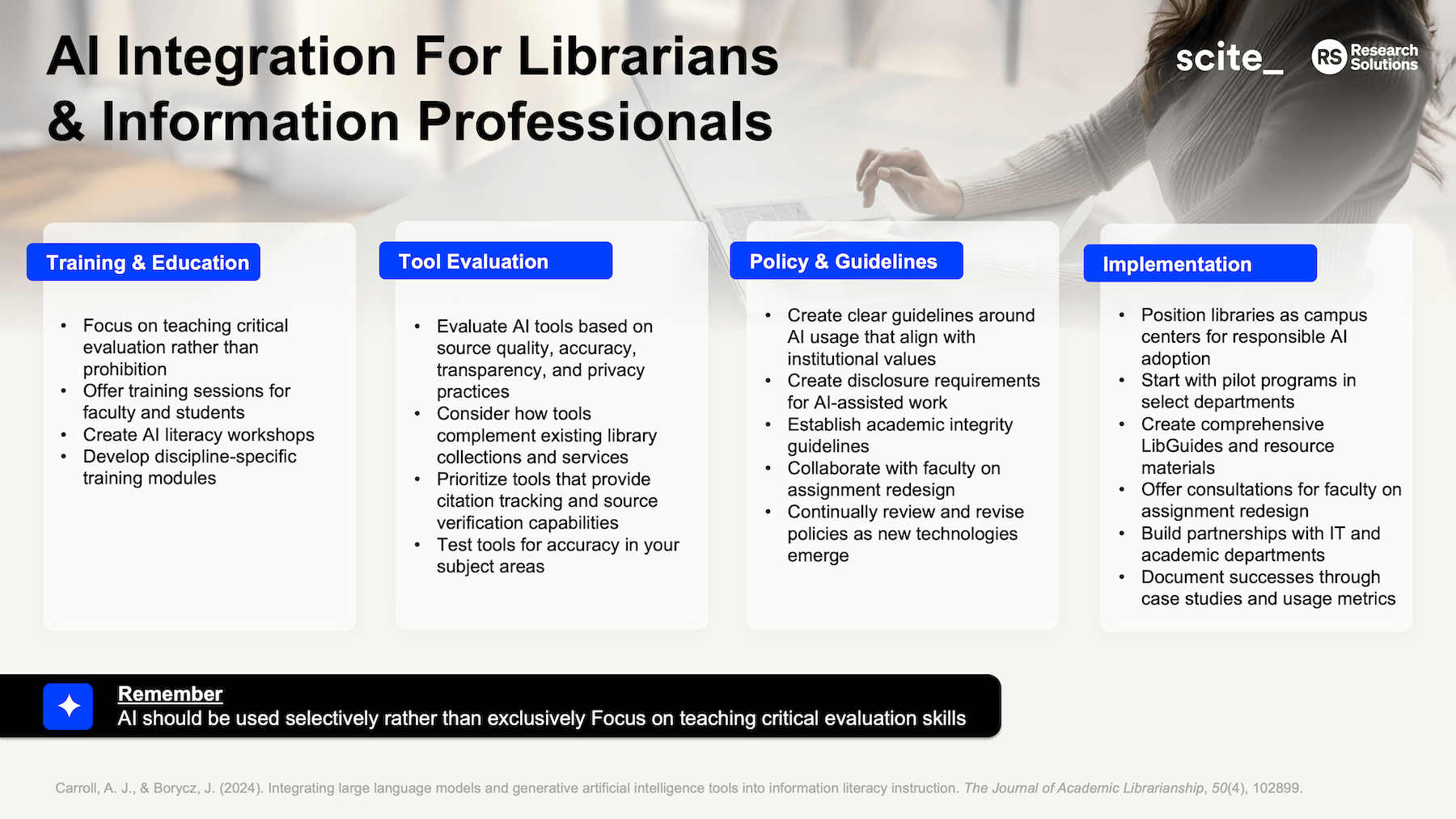 A practical approach: focus on evaluation criteria rather than specific tools. Teach people to ask whether a tool provides source verification, transparency about how it works, and compatibility with existing research workflows. These principles apply whether someone's evaluating Scite, another AI research tool, or whatever launches next month.