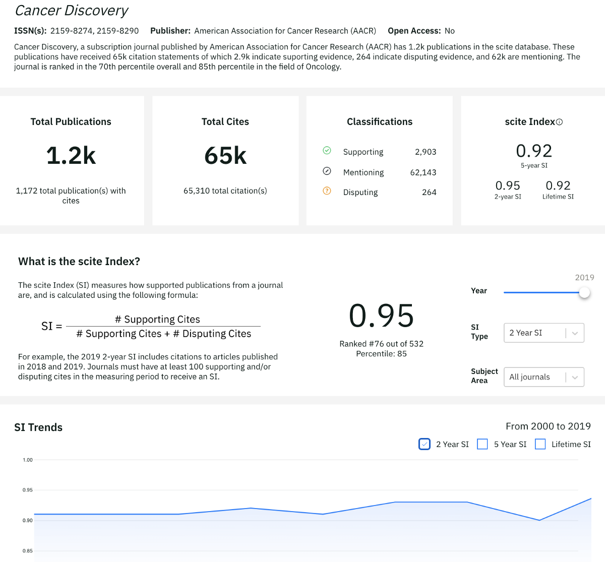 scite journal dashboards allow you to see how articles within a scientific journal have been cited by others, what the overall citation metrics are for that journal, how these journal metrics have changed over time, and what the most highly cited, supported, and disputed articles are within that journal. You can access this information from any scite report by clicking on the journal name, or directly from the new scite journal page.